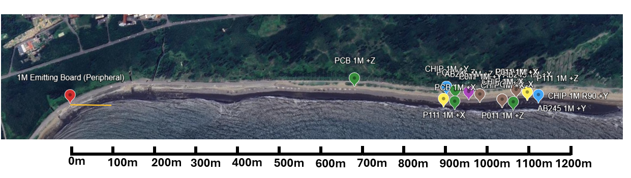 有鉴于此,本次 MN54L 的测试设计目标,是直接承袭 MN52H 的高标准验证模式,确保数据能够真实反映 MN54L 模块在复杂或要求严苛的应用中(例如:Bluetooth Mesh、Thread、Matter 等),所能达成的最强性能。我们仍采用MN52H-U40作为 MASTER/CENTRAL 装置以确保与先前的测试的一致性,并与具有不同天线配置的MN54L模块进行双向通讯测试。在海滩这种开放场域进行测试,可以最小化环境障碍物及周围无线电讯号的影响。